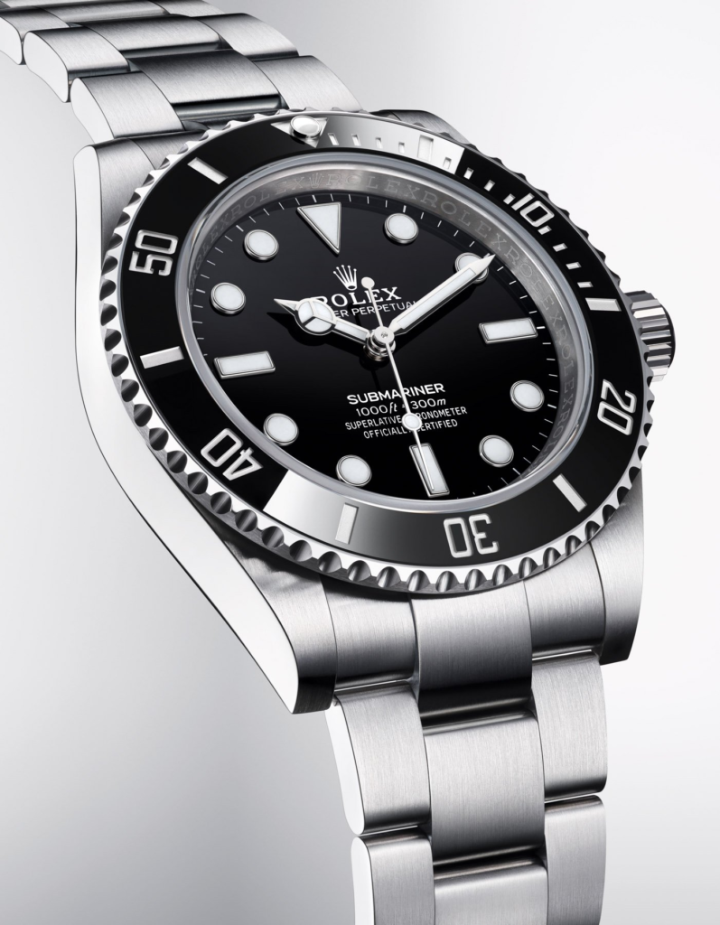 The no‑date dial is what truly defines this model. Removing the date window at 3 o’clock creates perfect symmetry, a cleaner look, and greater legibility. Purists love this faithful nod to the original 1953 Submariner, which launched without a date function. The black dial features large, highly visible markers and hands filled with Rolex’s blue‑glowing Chromalight, ensuring easy reading day or night.